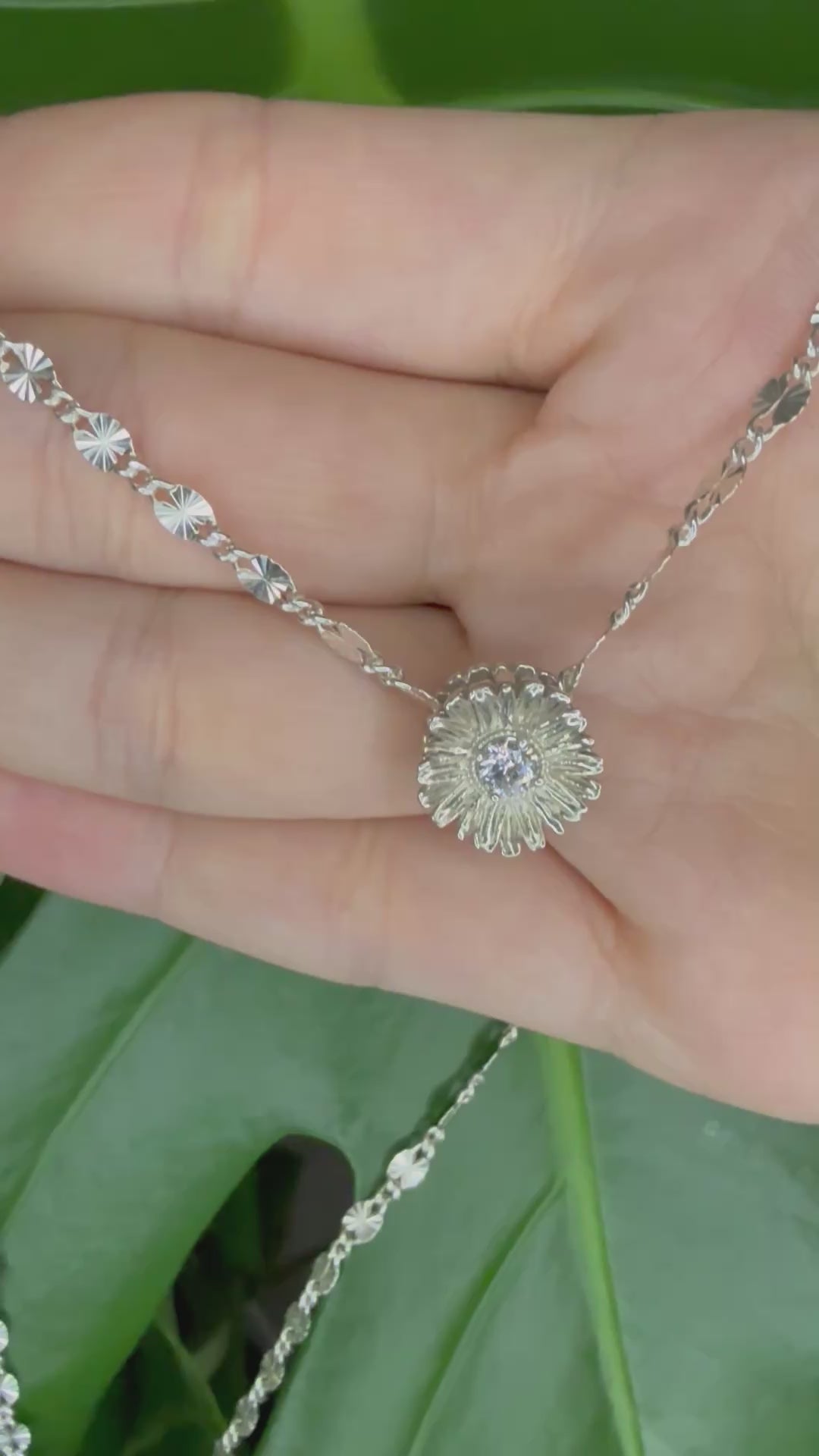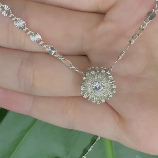 Introducing our exquisitely crafted Daisy flower necklace, symbolizing April's birth month, made from pure Sterling Silver, 925. A brilliant round diamond, representing April's birthstone, graces its center, adding a sparkling touch.