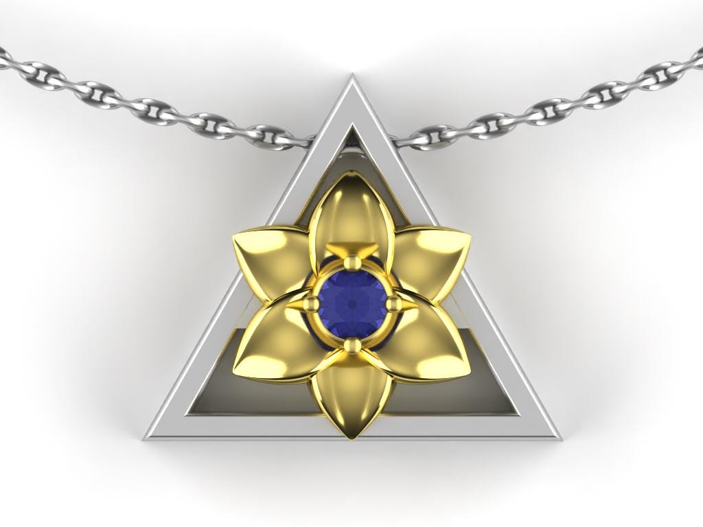 This stunning necklace features a handcrafted Gold Narcissus, the December birth flower, meticulously formed from pure Sterling Silver 925. The triangle shape that surrounds the flower represents the four elements from Greek philosophy (fire, earth, water, and air). The pendant is made so that the wearer has the option of wearing the triangle facing up or down. At its heart lies a breathtaking genuine Tanzanite, radiating elegance and charm.