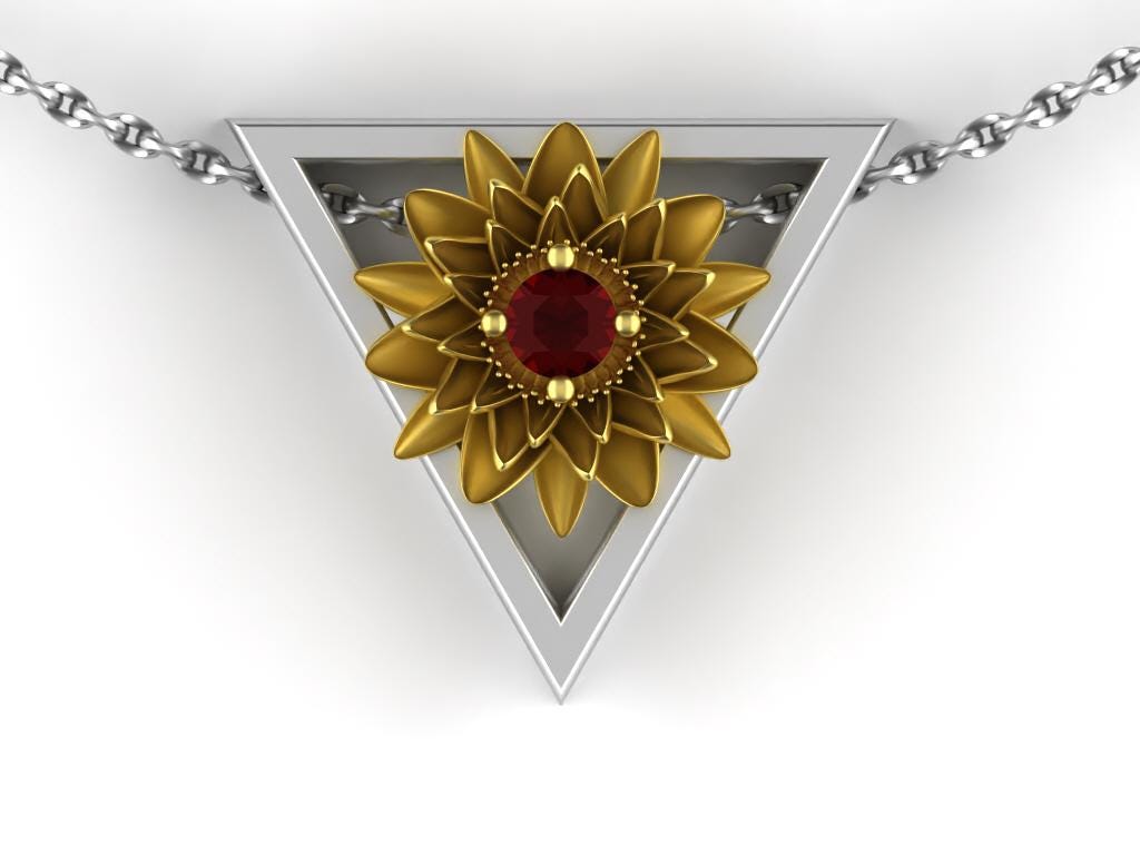 Celebrate July with this exquisite necklace featuring a handcrafted gold Water Lily, July’s birth flower. Set in solid 925 Sterling Silver, the flower is framed by a triangle symbolizing the four classical Greek elements: fire, earth, water, and air.